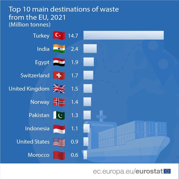Eurostat 2021 atık ihracatı verilerine göre Türkiye, 14,7 milyon tonla AB’den en fazla atık ithal eden ülke oldu. AB’den tüm atık ithalatının yaklaşık yarısı Türkiye’ye yapıldı.