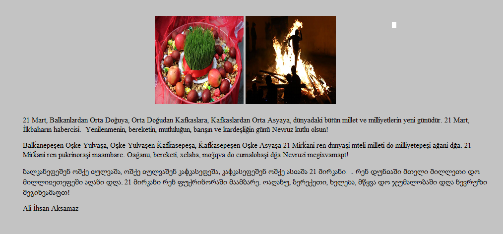 21 მირკანინი; ბალკანეფეშენ ოშქე ჲულვაშა, ოშქე ჲულვაშენ კაჶკასეფეშა, კაჶკასეფეშენ ოშქე ასჲაშა დუნჲაში მთელი მილლეთი დო მილლიჲეთეფეში აღანი ნდღა რენ. 21 მირკანი  ფუქრინორაში მაამბაე რენ. ოაღანუ, ბერექეთი, ხელება, მისობა დო ჯუმალობაში ნდღა ნევრუზი გეხვამერი ტას!
