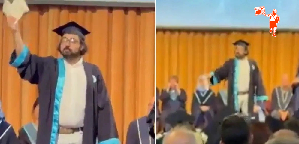 Üniversitenin mezuniyet töreninde kep atma kutlamaları devam ederken bir öğrenci, diplomasını aldığı sırada sahnede ayağa kalkarak bir konuşma yaptı.