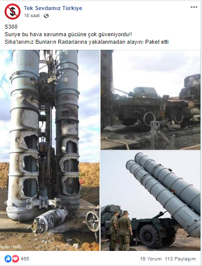 Türkiye’nin Suriye’ye düzenlediği askeri harekât, askeri içerikli sosyal medya paylaşımlarını artırdı. Sosyal medyada paylaşılan bazı fotoğraflarda SİHA’ların (Silahlı insansız hava aracı) Suriye’nin de kullandığı Rus hava savunma füze sistemi olan S-300’leri vurduğu iddia edildi. Paylaşılan gönderilerden yalnız biri 2 binden fazla beğeni aldı.