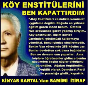Doğuda ise eşimin dedesi Muhtar Aras gibi, Köy Enstitülerini kapattıran Erivan doğumlu Kinyas Kartal, bugünkü Gürcistan ve Ermenistan sınırları içinde bulunan Bruki/Burukan aşireti Kürt aşiretinin liderlerindendi. Kinyas adı Rusça knyaz (prens) anlamındadır. Tiflis askeri lisesinde ve Baku Askeri Akademisi’nde eğitim gören Kinyas Kartal, Troçki’nin komutası altında Kızıl Ordu’da görev aldı. Ancak 1921’i izleyen yıllarda Bruki aşireti topluca Türkiye’ye göçünce, Rus kökenli olan eşiyle birlikte Türkiye’ye geldi. 1930 ve 1960’lı yıllarda iki kez sürgün edildi. 1965-1980 yılları arasında ise Adalet Partisi listesinden TBMM 2. 3. 4. ve 5. dönem Van milletvekilliği yaptı. Kendisi evli ve on çocuk babasıydı. Müsakeşeci bir adam olduğu için Adnan Menderes ile kolayca anlaştı. Ve Ermenilerden kalan müsadere edilmiş yerlerin ve arazilerin müsakeşecisi oldu. Kendisi Türkiye’nin hala çözülemeyen toprak reformu sorununun da bir parçasıydı.