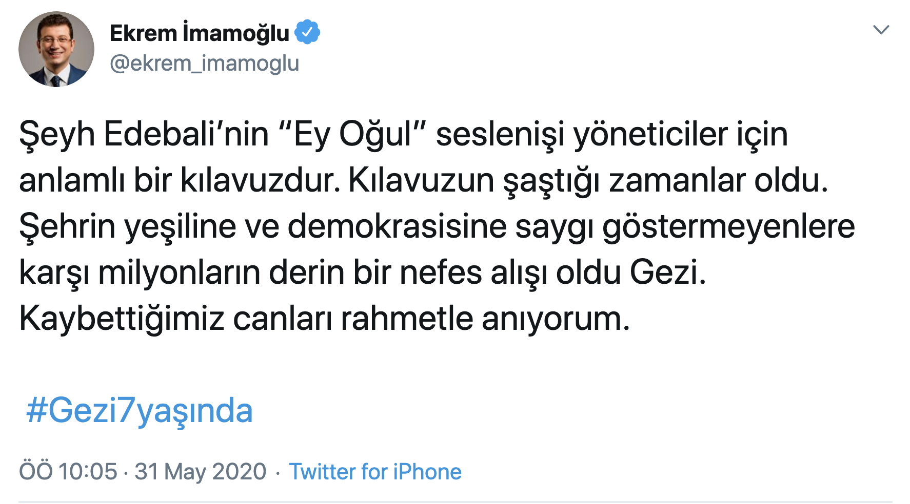 İmamoğlu sosyal medya hesabından yaptığı paylaşımda, “Şeyh Edebali’nin ‘Ey Oğul’ seslenişi yöneticiler için anlamlı bir kılavuzdur. Kılavuzun şaştığı zamanlar oldu. Şehrin yeşiline ve demokrasisine saygı göstermeyenlere karşı milyonların derin bir nefes alışı oldu Gezi. Kaybettiğimiz canları rahmetle anıyorum.” ifadesini kullandı.