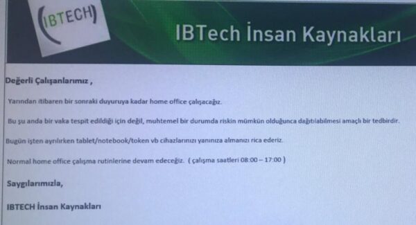 IBTech’in çalışanlarına gönderdiği mesajda “Yarından itibaren bir sonraki duyuruya kadar home office çalışacağız. Bu şu anda bir vaka tespit edildiği için değil, muhtemel bir durumda riskin mümkün olduğunca dağıtılabilmesi amaçlı bir tedbirdir” denildi.