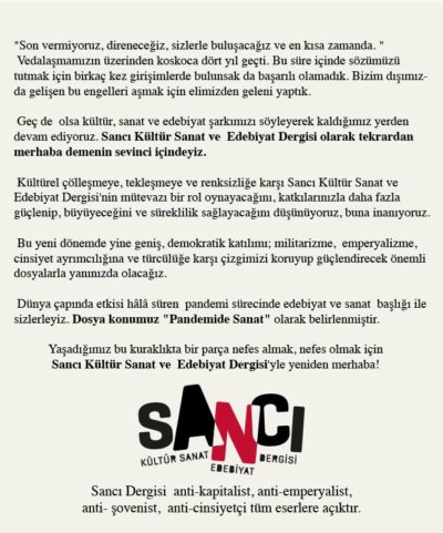 Yaşadığımız bu kuraklıkta bir parça nefes almak, nefes olmak için Sancı Kültür Sanat ve Edebiyat Dergisi’yle yeniden merhaba!”