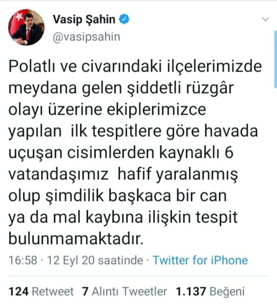 Ankara Valisi Vasip Şahin fırtına ile ilgili bir twitt paylaştı, ”Polatlı ve civarındaki ilçelerimizde meydana gelen şiddetli rüzgâr olayı üzerine ekiplerimizce yapılan ilk tespitlere göre havada uçuşan cisimlerden kaynaklı 6 vatandaşımız hafif yaralanmış olup şimdilik başkaca bir can ya da mal kaybına ilişkin tespit bulunmamaktadır.” ifadesini kullandı.