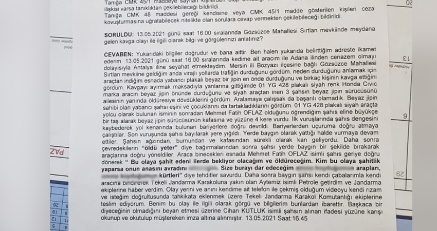 Daha sonra çevredekilerin ‘öldü yeter’ diye bağırmalarından sonra şahsı yerde baygın bir şekilde bırakarak araçlarına doğru yöneldiler. Araca binecekleri esnada Mehmet Fatih Oflaz isimli şahıs geriye doğru dönerek, ‘Bu olaya şahitlik edeni ileride bekliyor olacağım ve öldüreceğim. Kim bu olaya şahitlik yaparsa… Size burayı dar edeceğim. … Kürtleri’ diye tehditler savurdu. Daha sonra baygın şahsı kendi çabalarımla aracıma bindirerek Tekeli Jandarma Karakolu’na yakın olan Aytemiz isimli petrole getirdim ve jandarma ekiplerine haber verdim.”