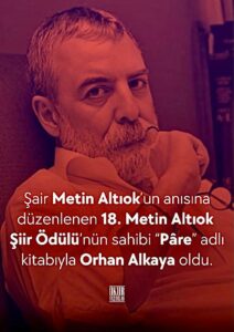 Madımak Katliamı’nda yaşamını yitiren değerli şair Metin Altıok’un anısını yaşatmak amacıyla düzenlenen 18. Metin Altıok Şiir Ödülü’nün sahibi belli oldu. Bu yılki ödül, “Pâre” adlı şiir kitabıyla şair ve tiyatro yönetmeni Orhan Alkaya’ya verildi.