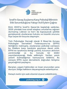 Dernek tarafından yapılan açıklamada, 8 Nisan tarihinde European Federation of Psychologists’ Associations’ya gönderilen mektupta, başta Gazze olmak üzere Filistin, Lübnan ve İran’da yaşanan savaş suçları ile sivil kayıplara karşı uluslararası psikoloji camiasının sorumluluk almasının talep edildiği belirtildi.