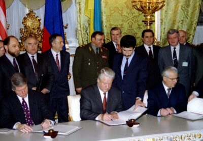 Memorandum ilk olarak üç nükleer güç olan Rusya, Amerika Birleşik Devletleri ve Birleşik Krallık tarafından imzalanırken diğer nükleer güçler olan Çin ve Fransa ise ayrı belgelerde biraz daha zayıf bireysel güvenceler verdi.1 Memorandum, Ukrayna, Beyaz Rusya ve Kazakistan’ın toprak bütünlüğüne veya siyasi bağımsızlığına yönelik tehditlere veya güç kullanımına karşı güvenlik güvenceler de içermekteydi. Sonuç olarak, 1994 ve 1996 yılları arasında Beyaz Rusya, Kazakistan ve Ukrayna Sovyetler Birliğinin yerleştirdiği nükleer silahlarından vazgeçti.(Wikipedia)